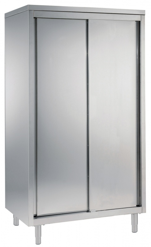 Constructed in stainless steel. Intermediate shelves, supports and inner doors in stainless steel. Handles are formed by a fold in the sliding doors. Adjustable feet.