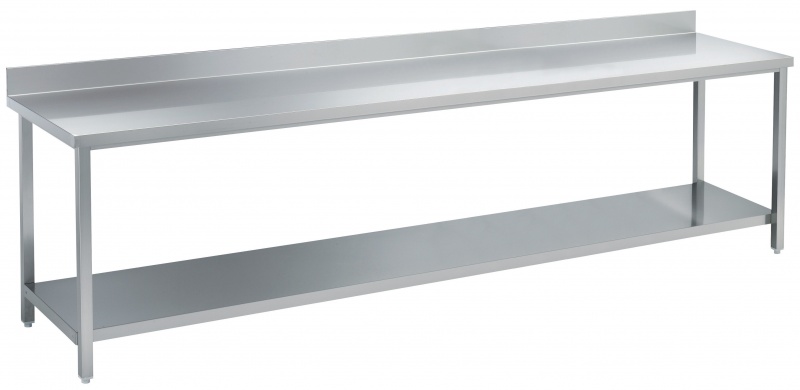 Die 50 mm hohe Arbeitsplatte aus 1 mm Chromnickelstahl 1.4301, hat abgekantete Ecken und eine Lärmdämm-Einlage aus wasserdichtem, feuerfestem Material. Mit rückseitiger Aufkantung, 100 mm hoch. Untergestell aus 40 x 40 mm Profil auf höhenverstellbaren Füßen aus Chromnickelstahl 1.4301.