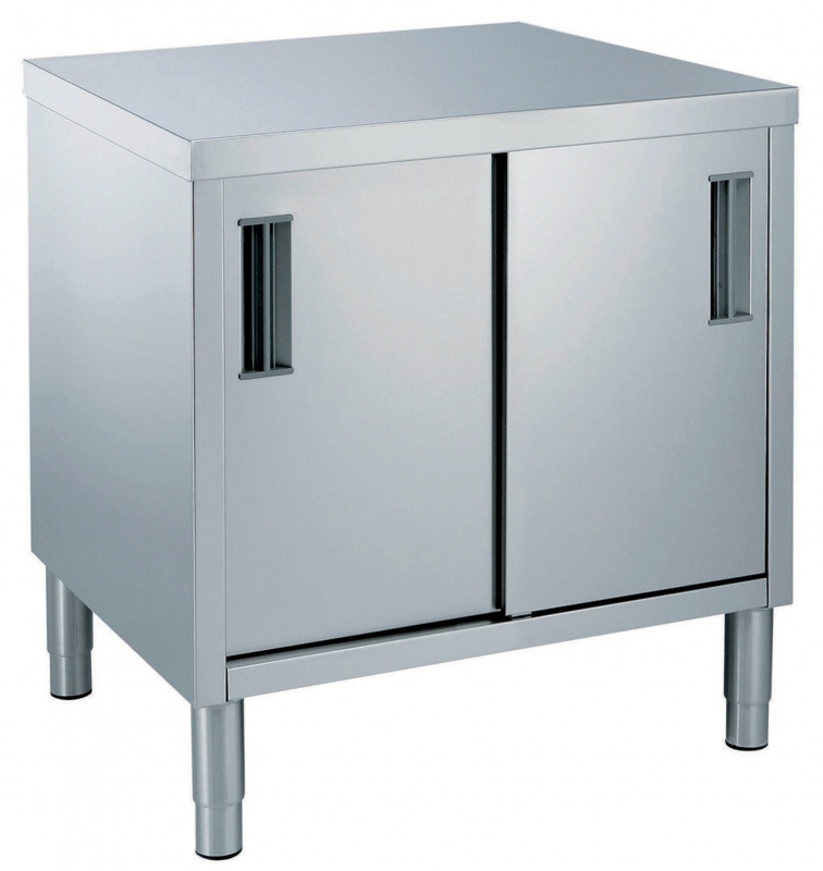 Die 50 mm hohe Arbeitsplatte aus 1 mm Chromnickelstahl 1.4301, hat abgekantete Ecken und eine Lärmdämm-Einlage aus wasserdichtem, feuerfestem Material. Schrankraum mit einem Bord auf höhenverstellbaren Füßen aus Chromnickelstahl 1.4301.