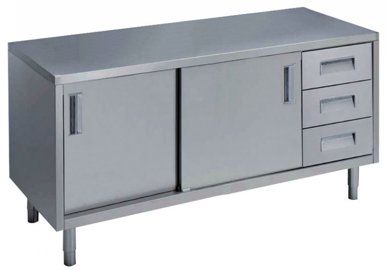 Die 50 mm hohe Arbeitsplatte aus 1 mm Chromnickelstahl 1.4301, hat abgekantete Ecken und eine Lärmdämm-Einlage aus wasserdichtem, feuerfestem Material. Schrankraum mit einem Bord und zwei Schiebetüren auf höhenverstellbaren Füßen aus Chromnickelstahl 1.4301. Schubladenstock mit drei Teleskop-Schubladen rechts.
