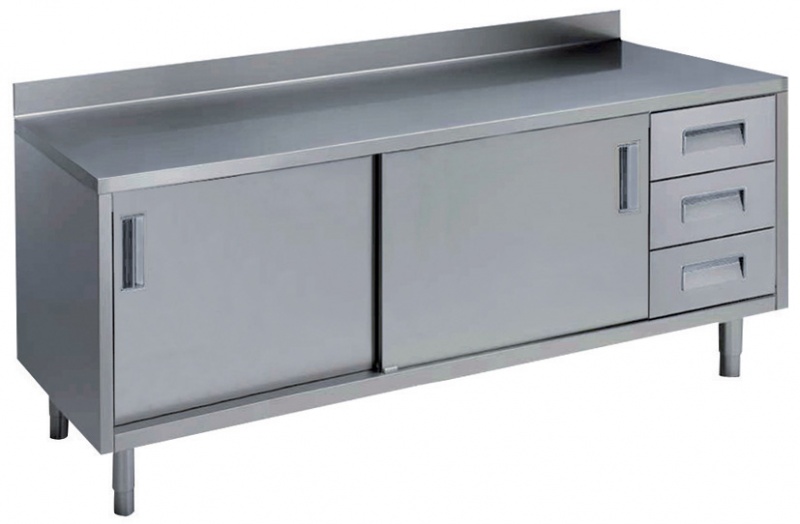 Die 50 mm hohe Arbeitsplatte aus 1 mm Chromnickelstahl 1.4301, hat abgekantete Ecken und eine Lärmdämm-Einlage aus wasserdichtem, feuerfestem Material. Schrankraum mit einem Bord und zwei Schiebetüren auf höhenverstellbaren Füßen aus Chromnickelstahl 1.4301. Schubladenstock mit drei Teleskop-Schubladen rechts. Aufkantung 100mm.