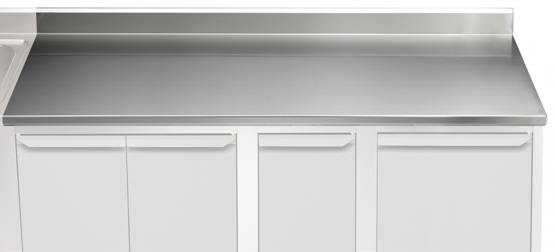 Ausführung in CrNi 1.4301; Die 40 mm hohe Arbeitsplatte ist mit einer 18 mm starken, schalldämmenden Unterfütterung ausgestattet; Front und Rückseite der Platte mit längs laufendem Verstärkungskanal; Entgratete Frontprofil in Spezialform zum Schutz gegen Undichten; Voll verschweißte und glatt polierte Ecken; 100 mm hohe, extra starke, rückseitige Aufkantung mit einem oberen Winkel von 45° und voll verschweißten Seiten; Die Arbeitsplatten können auf Konsolen, Beine oder Unterbauten montiert werden, um eine Arbeitshöhe von 900 mm zu erhalten;