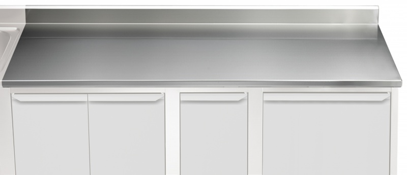 Ausführung in CrNi 1.4301; Die 40 mm hohe Arbeitsplatte ist mit einer 18 mm starken, schalldämmenden Unterfütterung ausgestattet; Front und Rückseite der Platte mit längs laufendem Verstärkungskanal; Entgratete Frontprofil in Spezialform zum Schutz gegen Undichten; Voll verschweißte und glatt polierte Ecken; 100 mm hohe, extra starke, rückseitige Aufkantung mit einem oberen Winkel von 45° und voll verschweißten Seiten; Die Arbeitsplatten können auf Konsolen, Beine oder Unterbauten montiert werden, um eine Arbeitshöhe von 900 mm zu erhalten;