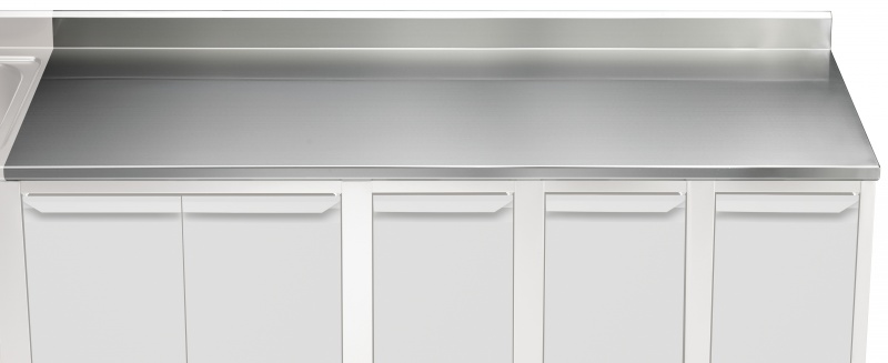 Ausführung in CrNi 1.4301; Die 40 mm hohe Arbeitsplatte ist mit einer 18 mm starken, schalldämmenden Unterfütterung ausgestattet; Front und Rückseite der Platte mit längs laufendem Verstärkungskanal; Entgratete Frontprofil in Spezialform zum Schutz gegen Undichten; Voll verschweißte und glatt polierte Ecken; 100 mm hohe, extra starke, rückseitige Aufkantung mit einem oberen Winkel von 45° und voll verschweißten Seiten; Die Arbeitsplatten können auf Konsolen, Beine oder Unterbauten montiert werden, um eine Arbeitshöhe von 900 mm zu erhalten;