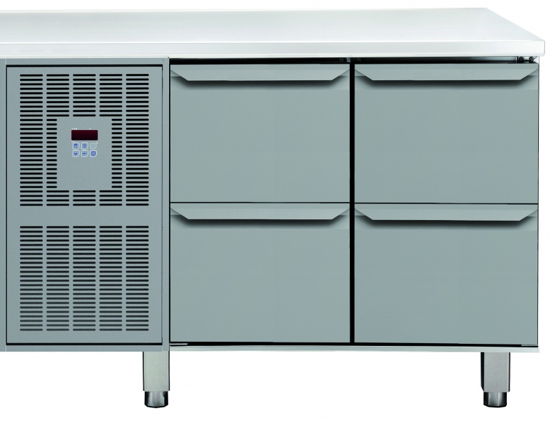 Constructed entirely in 304 AISI stainless steel. Base and ceiling pressed with rounded corners. Drawers in 304 AISI stainless steel with telescopic runners for easy extraction of GN containers. Easily removable guides and condensate bowl. Temperature range from -2°C/+10°C. Built-in refrigeration unit to operate in ambient temperatures up to +43°C. 50mm high density injected polyurethane foam. CFC and HCFC free. Pre-programmed defrosting cycle with automatic evaporation of condensing water. Fitted with evaporator, fan, thermostatic valve, control panel and digital display. 150mm height-adjustable (0/+90mm) oversized feet (65x65mm) can be removed for masonry installation.