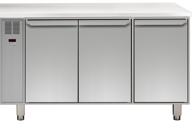 Constructed entirely in 304 AISI stainless steel. Base and ceiling pressed with rounded corners. Self-closing hinged doors. Easily removable guides, racks and condensate bowl. Temperature range from -2°C/+10°C. Remote refrigeration unit to operate in ambient temperatures up to +43°C. 50mm high density injected polyurethane foam. CFC and HCFC free. Fitted with evaporator, fan, thermostatic valve, control panel and digital display. 150mm height-adjustable (0/+90mm) oversized feet (65x65mm) can be removed for masonry installation.