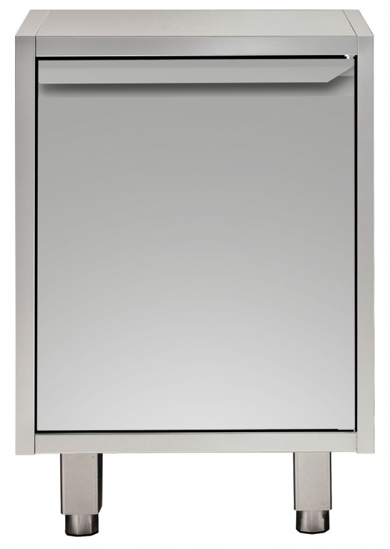Ausführung in CrNi 1.4301; Front und Rückseite der Platte mit längslaufendem Verstärkungskanal; Innen- und Außenseitenblenden mit schalldämmender Unterfütterung zur Verstärkung der Struktur; Türen mit schalldämmender Innenblende und Scharnieren aus CrNi 1.4301, Öffnung bis 180°; Große (65 x 65 mm), höhenverstellbare (0/+90 mm), 150 mm hohe Füße, abnehmbar für Sockelaufstellung; Inneres seitliches 45° Eckverbindungssystem; Zwischenboden aus CrNi 1.4301 mit innerer Doppelkante zum Vermeiden von Spalten zwischen den Seiten und der Rückwand, Bord höhenverstellbar in 3 Stufen, mit verzugfester Edelstahlstütze;
