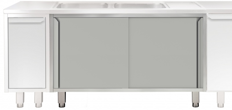 Ausführung in CrNi 1.4301; Front- und Rückseite der Platte mit längslaufendem Verstärkungskanal; Türen mit schalldämmenden Innenblenden und Scharnieren aus CrNi 1.4301, Öffnung bis 180°; Große (65 x 65 mm), höhenverstellbare (0/+90 mm), 150 mm hohe Füße,