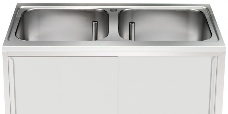 Made from 304 AISI stainless steel. The 40mm high worktop is in 304 AISI stainless steel. Heavy duty splashback is 100mm high with a 45° top angle with welded sides and rear part covered by stainless steel profile. Bowls fully welded and with polished corners.Bowls mm600x500x250h with overflow pipe and 70Ø drain holes.