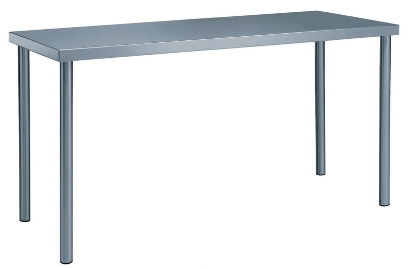 Die 50 mm hohe Arbeitsplatte aus 304 AISI Edelstahl, Materialstärke 1,5 mm, ist schalldicht und besitzt U-förmig nach innen gebogene Kanten sowie verschweißte Ecken. Die Arbeitsplatte umfasst eine wasserdichte Holzschicht, Materialstärke 18 mm. Runde Beine und Füße aus 304 AISI Edelstahl, Durchmesser 50 mm. Die Füße sind höhenverstellbar (-60 + 10 mm).