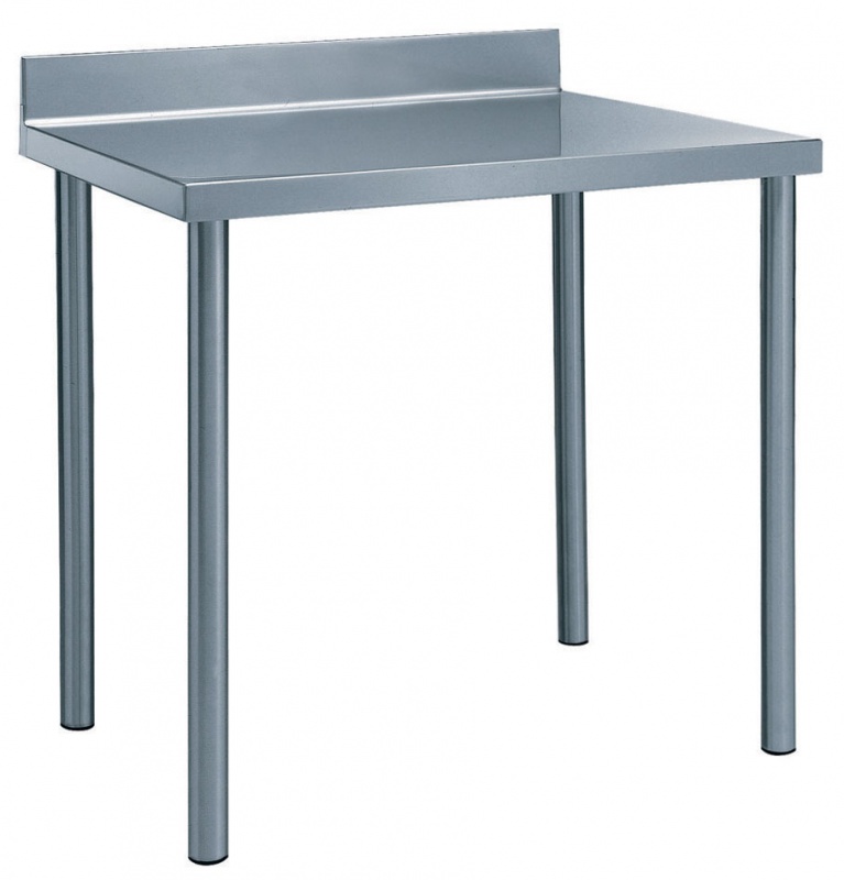 Die 50 mm hohe Arbeitsplatte aus 304 AISI Edelstahl, Materialstärke 1,5 mm, ist schalldicht und besitzt U-förmig nach innen gebogene Kanten sowie verschweißte Ecken. Die Arbeitsplatte umfasst eine wasserdichte Holzschicht, Materialstärke 18 mm. Umlaufende hintere Aufkantung, h=100 mm, abgerundet mit einem Radius von 10 mm. Runde Beine und Füße aus 304 AISI Edelstahl, Durchmesser 50 mm. Die Füße sind höhenverstellbar (-60 + 10 mm).