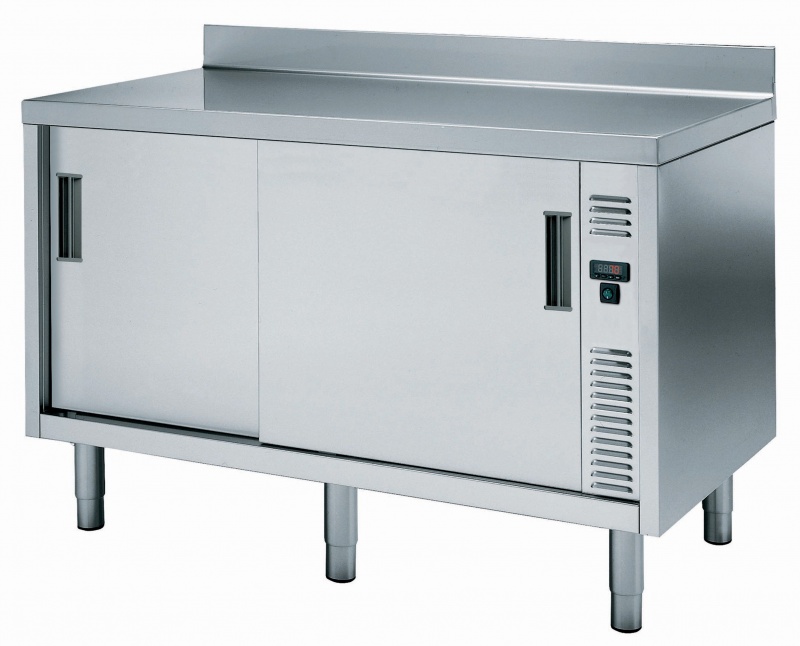 aus CrNi 1.4301, Arbeitsplatte 1,5 mm, 4-seitig Abbug 50 mm, 100 mm Aufgekantet, schall- und wasserabweisend, unterleimt Wärmeschrank, Umluftheizung, thermostatisch regulierbar bis +80° C analoge Thermperaturanzeige höhenverstellbares Zwischenbord, Schiebetüren, Füsse höhenverstellbar