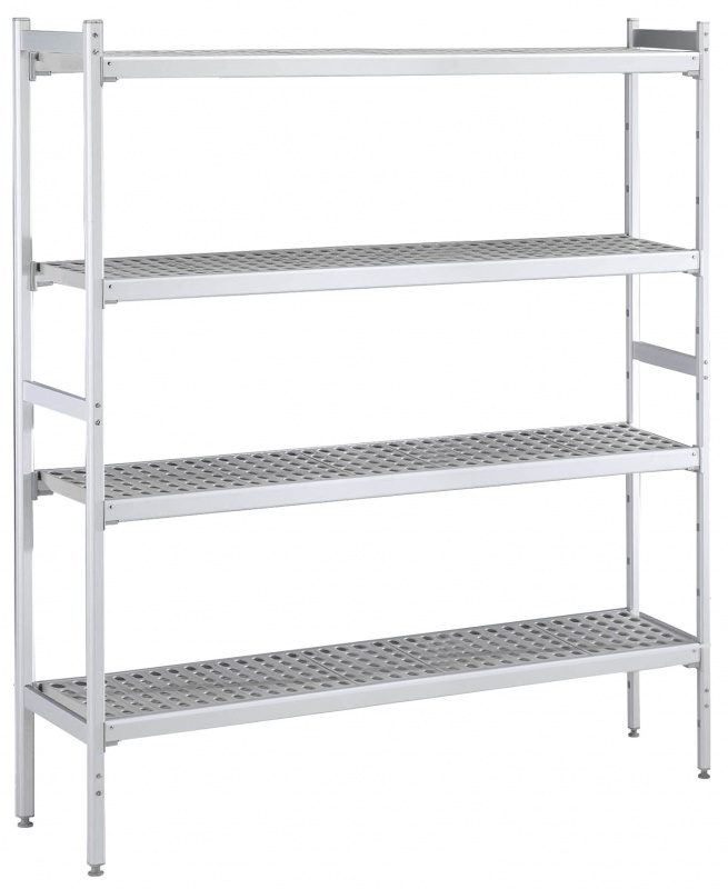 For linear installation. 4-level shelving set with louvered sectional polyethylene shelves (depth=475mm). Aluminium (20 micron) side uprights (height=1700mm). Adjustable feet.