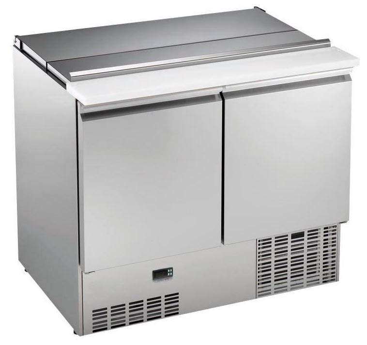 2-türige Saladette mit eingeschäumtem Verdampfer und Ventilator im Innenraum; außen und innen aus CNS DIN 1.4301; gefertigt nach ISO 9001; CE geprüft; Ausschnitt in der Abdeckung mit vielfältigen Bestückungsmöglichkeiten nach GN 1/1 Maß, bzw. deren Unterteilung (Bestückungsbeispiele lt. Zeichnung), serienmäßig inkl. 9 Verbindungsstegen zur einfachen Behälterunterteilung; Abdeckung durch eine ineinanderschiebbare Abdeckung aus Chromstahl; bedienungsseitig lebensmittelechtes Schneidbrett; Isolierung 40 mm, Rückseite 45 mm Cyclopentan-Hartschaum; Türen mit Griffleiste, seitlich nicht überstehend; großes Vorratsfach für GN-Behälter oder GN 1/1-Roste; Maschinenfach unten mit steckerfertiger, herausziehbarer Kältemaschine; Thermostat;, automatische Abtauung mit Tauwasserverdunstung; Innenraum in Hygieneausführung mit abgerundeten Ecken und je 1 Bodenablauf für Reinigungs- und Tauwasser; Reinigungswasserauffangschale im Maschinenfach.
