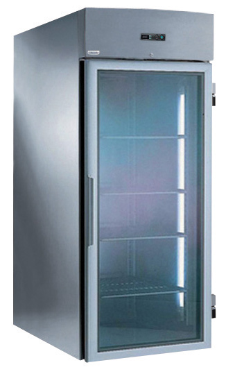Innen und außen aus CNS 1.4301. 75 mm dicke Isolierung. Glastür mit Rechtsanschlag und beheiztem Rahmen. Eingebaute Kälteeinheit, Umluftkühlung, digitale Steuerung, automatische Abtauung, digitales Temperaturdisplay. Innenbeleuchtung. Betriebstemperatur +2/+10°C. Für Umgebungstemperatur bis +32 °C. FKW und FCKW frei. Kältemittel R134a. Gas in der Ausschäumung: Cyclopentan.