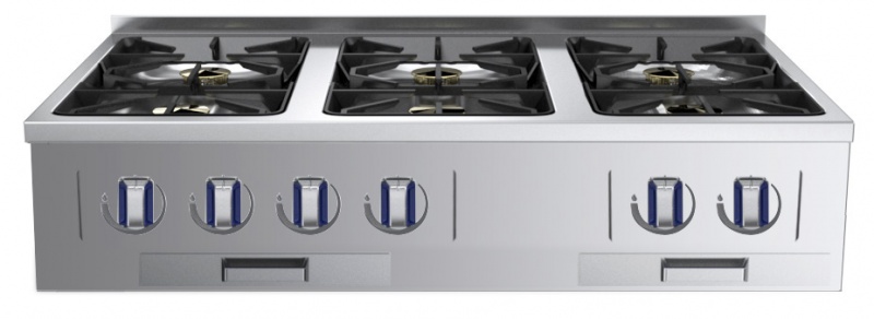Konstruktion gemäß DIN 18860_2, 20 mm Deckplatte mit Tropfnase. Innerer Tragerahmen aus 2 mm und 3 mm Chromnickelstahl 1.4301 für besondere Stabilität. 2 mm Deckplatte aus Chromnickelstahl 1.4301. Konstruktion mit ebenen, reinigungsfreundlichen Flächen. Durch das THERMODUL-Verbindungssystem entsteht bei Aufstellung der Geräte nebeneinander eine fugenlose Arbeitsplatte, und das Eindringen von Schmutz wird verhindert. 6 Gasbrenner (je 7 kW) mit optimierter Verbrennung, Flammenwächter, Thermoelement, Sicherheitshandventil und geschützter Zündflamme. Dreikreis-„flower flame'-Brenner mit Spezialdesign zum Vermeiden von Verstopfen. Manuelle Gasventile für genaue Regelung der Flammenstärke. Große Topfträger aus Gusseisen mit langen Mittelstreben für unterschiedlich große Töpfe. ECOFLAM-Topferkennung zum Energiesparen und Verringern überflüssiger Wärmeabstrahlung in die Küche. Tiefe Fettauffangschale mit gerundeten Ecken und Ablauföffnung. Metallknebel mit eingelassenem, hygienischem „weichem' Silikongriff für leichte Handhabung und Reinigung. IPX4 Spritzwasserschutz. Konfiguration: Einseitige Bedienung, Deckplatte mit Aufkantung.