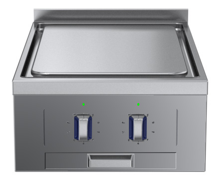 Konstruktion gemäß DIN 18860_2, 20 mm Deckplatte mit Tropfnase. Innerer Tragerahmen aus 2 mm und 3 mm Chromnickelstahl 1.4301 für besondere Stabilität. 2 mm Deckplatte aus Chromnickelstahl 1.4301. Konstruktion mit ebenen, großzügig gerundeten, reinigungsfreundlichen Flächen. Durch das THERMODUL-Verbindungssystem entsteht bei Aufstellung der Geräte nebeneinander eine fugenlose Arbeitsplatte, und das Eindringen von Schmutz wird verhindert. Kochfeld (400 x 640 mm) aus glattem, porenfreiem Flußstahl. 2 separat regelbare Heizzonen (je 4 kW) mit 2 elektronischen Sensoren je Zone und 8 Leistungsstufen zur Tempertaturregelung. Die Platte heizt schnell auf und ist kontinuierlich betriebsbereit. Ein Überhitzungsschutz schaltet die Stromzufuhr bei Überhitzung ab. Standbyfunktion spart Energie und erreicht schnell die maximale Leistung. Metallknebel mit eingelassenem, hygienischem „weichem' Silikongriff für leichte Handhabung und Reinigung. IPX5 Strahlwasserschutz. Konfiguration: Einseitige Bedienung, Deckplatte mit Aufkantung.