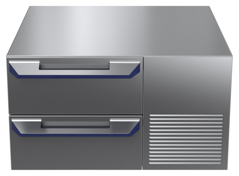 Refrigerated base with 2 drawers, able to oprate both as refrigerator or as freezer, with temperature range from -22°C to +8°C. Constructed according to 1.4301 (AISI 304) with anti-tilt runners accepting GN 1/1 containers. Built-in compressor unit to suit operating conditions. CFC free (ecological refrigerant type: R404a, - gas in foam: cyclopenthane). Flat surface construction, easily cleanable. Metal knobs and handles ergonomically designed with embedded hygienic silicon 'soft' grip enable easier handling and cleaning. IPX5 water resistance certification. Configuration: One-side operated freestanding base.