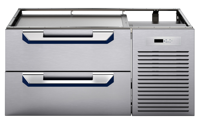 Modulare Großküchengeräteserie thermaline 90 - 1200 mm Ref-freezer Base with 2 drawers, 1 Side, H=550 (R290). Griffe und Böden in ergonomischem Design mit Silikongriff für leichte Handhabung und Reinigung.
