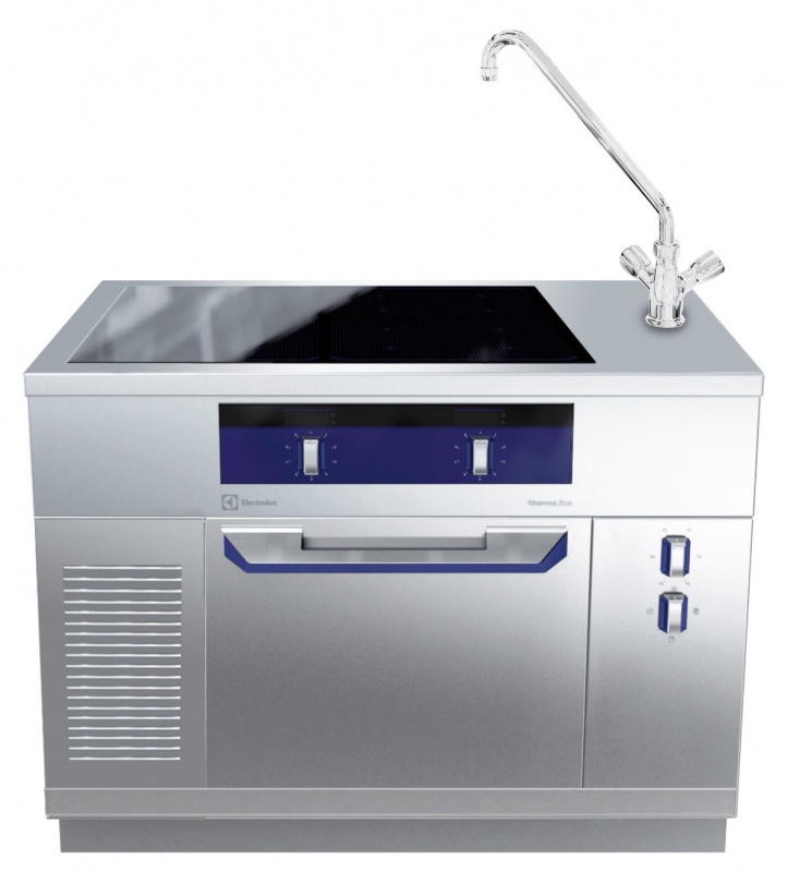Konstruiert nach DIN 18860_2, 20 mm Deckplatte mit Tropfnase, 70 mm zurückgesetzter Sockel. Innenrahmen aus 2 und 3 mm CNS 1.4301 für extra große Stabilität. 2 mm Deckplatte aus CNS 1.4301. Reinigungsfreundliche Konstruktion mit ebenen Flächen. THERMODUL-Verbindungssystem ermöglicht bündige Deckplatte bei Aufstellung nebeneinander und verhindert Eindringen von Schmutz. Großflächen-Ceranglasplatte mit mehreren Spulen, ohne Schmutzecken für leichte Reinigung. Mit 9 Leistungsstufen, schnellem Aufheizen auf die Höchstleistung und sehr geringer Wärmeabgabe in die Küche. Überhitzungsschutz schaltet die Energiezufuhr bei zu hoher Temperatur ab. Metallknebel mit eingelassenem, hygienischem, „weichem' Silikongriff für leichte Bedienung und Reinigung. Statischer Elektroofen mit 40 mm dicker Tür und Bodenplatte aus gerilltem, emailliertem Stahl. Garraum mit 2 Einschüben für GN 2/1 Roste für gleichzeitiges und schnelles Braten. Hochleistungsthermostat bis 300°C , elektronischer Sensor für genaue Temperaturregelung und manuelle Feuchtigkeitsregelung im Garraum. Oberes Heizelement auch zum Grillen einsetzbar, mit oder ohne Lüftung. IPX5 Strahlwasserschutz-Zertifizierung. Konfiguration: Freistehend, beidseitige Bedienung, Wasserarmatur rechts.