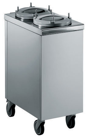 304 AISI stainless steel worktop with rounded edges. Two heated cylinders (+50°C) able to accomodate up to 50 plates (diam. 180-240mm). Side panels in stainless steel. The unit is mounted on 4 wheels (150mm high).