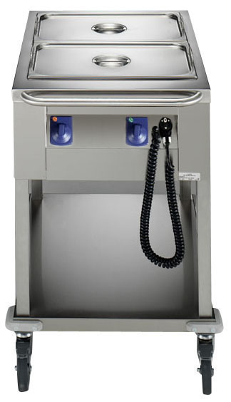 Rahmen aus Vierkantrohr (40 x 40 mm), Platten, Arbeitstisch, Becken und eingebaute untere Ablage aus CrNi 1.4301; 4 Schwenkräder mit Durchmesser 125 mm, zwei mit Bremse; 4 integrierte Puffer; Ergonomischer Griff auf der Wagenoberseite; Aufgewickeltes Netzkabel mit bruchsicherer Sicherheitsverriegelung; Das Becken ist für GN-Behälter mit 200 mm Tiefe geeignet; Beheizung mittels foliengeätzter Heizelemente unter dem Becken (niedrige Verlustleistung); Temperaturregelung des Beckens von 30° bis 90 °C und 1/2' Abfluss mit Ablasshahn; Höchsttemperatur der Außenplatten unter 50 °C; Bedienblende mit 2 Kontrollleuchten für Betriebsanzeige und Heizbetrieb; IPX5 spritzwassergeschützt;