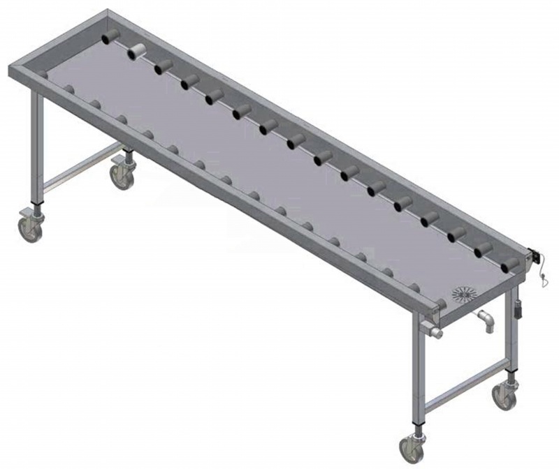 Aus Chromnickelstahl 1.4301. Wanne mit schrägem Boden und Ablauf. Rollen aus Kunststoff. Füße aus 40 x 40 mm Vierkantrohr mit 4 Rollen 125 mm Durchmesser, 2 mit Bremse. Geeignet für Geschirrspülmaschinenkörbe 500 x 500 mm. Mit Endplatte und Endschalter. Tisch wird zerlegt angeliefert.