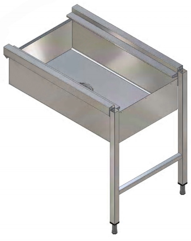 Aus Chromnickelstahl 1.4301. Wanne 800 x 530 x 300 mm mit schrägem Boden, Ablauf, Sieb und Auffangeimer. Gleitschienen. Höhenverstellbare Füße aus 40 x 40 mm Vierkantrohr. Geeignet für Geschirrspülmaschinenkörbe 500 x 500 mm. Anlieferung zerlegt.