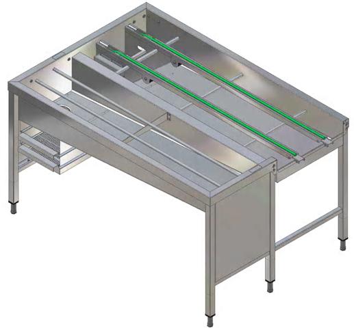 Constructed in 304 AISI stainless steel. Basin with sloping bottom, drain with double strainer baskets. Rack-guides inclined towards the sorting side. The unit must be completed with a drive unit to obtain motorized rack movement with variable speed. Emergency stop button included in drive unit. Twin reinforced PU cords, Ø 15mm.. Square 40x40mm tubular legs on height-adjustable feet. Designed for 500x500mm dishwashing baskets. Attachment to the drive unit or to cord conveyors on the right side. Basket feed direction: from left to right.