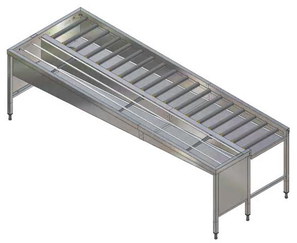 Constructed in 304 AISI stainless steel. Basin with sloping bottom, drain with double strainer baskets. Long plastic rollers. Rack-guides inclined towards the sorting side. Square 40x40mm tubular legs on height-adjustable feet. Designed for 500x500mm dishwashing baskets. Attachment to conveyor units on the right side. Basket feed direction: from left to right.