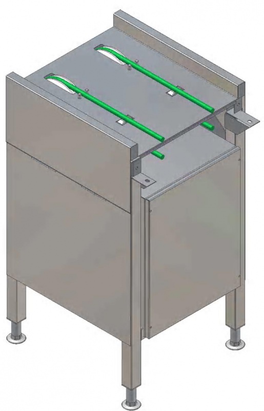 Constructed in 304 AISI stainless steel. Two cords in 15mm reinforced polyurethane. Square 40x40mm tubular legs on height-adjustable feet. Variable speed. Start/stop device and emergency switch. Designed for trays up to 375x530mm.