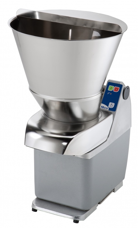 Für mittelgroße Cateringbetriebe mit bis zu 1000 Mahlzeiten je Schicht, speziell geeignet zum Scheiben- und Streifenschneiden, Reiben und Würfeln. Automatischer Edelstahltrichter ermöglicht die Verarbeitung großer Mengen bis 2.100 kg/h.Die mit Lebensmitteln in Kontakt kommenden Teile, Edelstahltrichter und Schneidkammer, können ohne Werkzeug abgenommen werden und sind geschirrspülmaschinenfest. Asynchroner Industriemotor für starke Belastung und lange Haltbarkeit. Motorbasis aus Aluminiumlegierung, vollständig geschlossen als Schutz gegen starken Wasserstrahl. Garantierte Sicherheit durch Mikromagnetschalter, der die Maschine bei nicht korrekt aufgesetztem Trichter anhält. Bedienblende mit IP55 Strahlwasserschutz und Spannungsausfall-Sicherung. Maschine mit 1 Geschwindigkeit (340 U.p.M.). Tischmodell. Trichter mit manueller Hebelbedienung, langer Gemüsetrichter und ergonomischer Wagen als Option lieferbar.