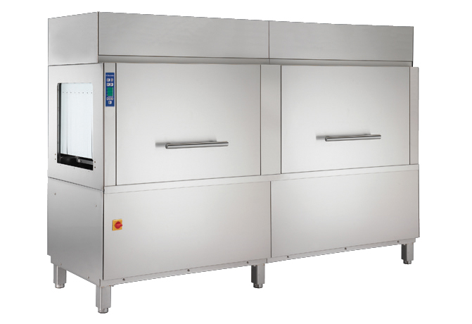 304 AISI stainless steel front and side panels, strainers and wash and rinse arms. Pressed prewash (100 liters) and wash tank (100 liters) for easier cleaning. Washing tubes in stainless steel. Double-skinned construction and counter balanced doors. Built-in pressure boiler. Self draining wash pump. Automatic start/stop function. Energy saving device. Detached prewash. Wash and single rinse in one compact module. 2 speeds variable on installation. Electric heating. HACCP autodiagnostic check control. Feeding direction: left to right.Hourly capacity: 1st speed 4500 dishes/250 baskets 2nd speed: 3240 dishes/180 baskets.