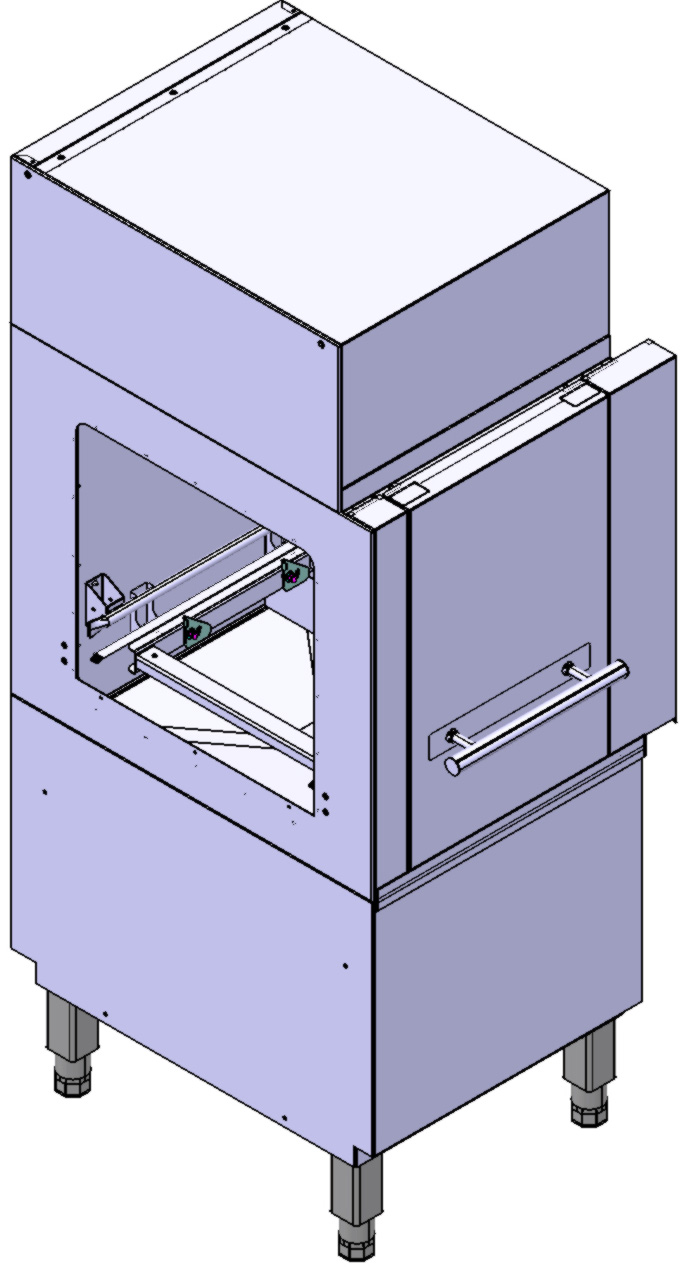Dryer for compact rack type dishwashers. 304 AISI stainless steel front, side and top panels. It provides completely dry dishes thanks to the high air temperature (50°-60°C) and the low humidity. The addition of the external air reduces the internal humidity thus increasing the drying efficiency. Electric heating by means of armoured elements and fan. Conveyor system guaranteed by a toothed drive belt connected to the dishwasher. Circulating air: 600 m³/h. Feeding direction from right to left.