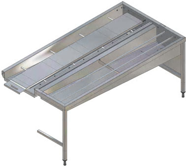 Constructed in 304 AISI stainless steel. Basin with sloping bottom, drain with double strainer baskets. Rack-guides inclined towards the sorting side. Dishwasher driven rack movement. Feeding bars and carriers. Square 40x40mm tubular legs on height-adjustable feet. Designed for 500x500mm dishwashing baskets. Attachment to the dishwasher on the left side. Basket feed direction: from right to left.