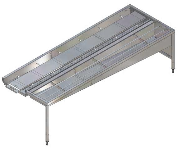 Constructed in 304 AISI stainless steel. Basin with sloping bottom, drain with double strainer baskets. Rack-guides inclined towards the sorting side. Dishwasher driven rack movement. Feeding bars and carriers. Square 40x40mm tubular legs on height-adjustable feet. Designed for 500x500mm dishwashing baskets. Attachment to the dishwasher on the left side. Basket feed direction: from right to left.