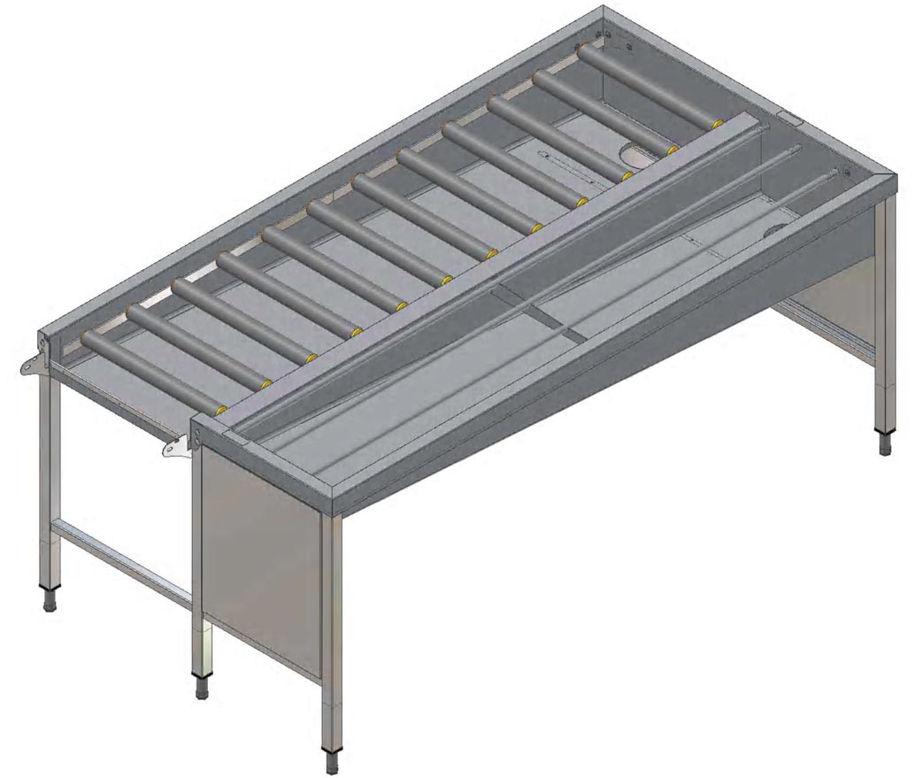 Constructed in 304 AISI stainless steel. Basin with sloping bottom, drain with double strainer baskets. Long plastic rollers. Rack-guides inclined towards the sorting side. Square 40x40mm tubular legs on height-adjustable feet. Designed for 500x500mm dishwashing baskets. Attachment to conveyor units on the right side. Basket feed direction: from left to right.
