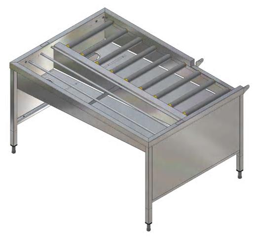 Constructed in 304 AISI stainless steel. Basin with sloping bottom, drain with double strainer baskets. Long plastic rollers. Rack-guides inclined towards the sorting side. Square 40x40mm tubular legs on height-adjustable feet. Designed for 500x500mm dishwashing baskets. Attachment to conveyor units on the right front side. Basket feed direction: from left to right.