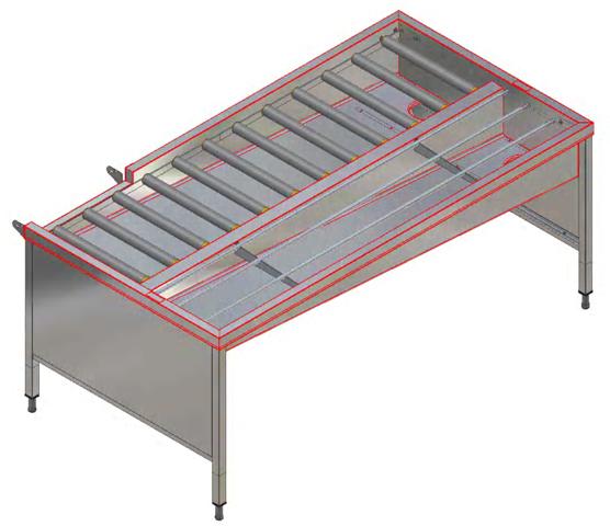 Constructed in 304 AISI stainless steel. Basin with sloping bottom, drain with double strainer baskets. Long plastic rollers. Rack-guides inclined towards the sorting side. Square 40x40mm tubular legs on height-adjustable feet. Designed for 500x500mm dishwashing baskets. Attachment to conveyor units on the left front side. Basket feed direction: from right to left.