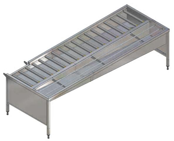 Constructed in 304 AISI stainless steel. Basin with sloping bottom, drain with double strainer baskets. Long plastic rollers. Rack-guides inclined towards the sorting side. Square 40x40mm tubular legs on height-adjustable feet. Designed for 500x500mm dishwashing baskets. Attachment to conveyor units on the left front side. Basket feed direction: from right to left.