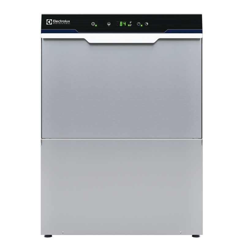 Unit shall be Electrolux Professional undercounter glasswasher type hot water rinsing using rack dimension of 500*500mm. Electrical characteristics to be 230 volts single phase 50Hz operation. Washing performance is ensure by a powerful wash pump, large capacity wash tank, upper and lower revolving spray arms. Soft start wash pump to avoid accidental breakage of crystal wares. Rinse temperature and pressure guaranteed by built in pressure boiler. Uses 3 liters of clean water per final rinse. Two automatic cycles for different types of wares. Double skin insulated door. 304 AISI stainless steel construction to include door, external panels, frame and wash tank. Electronic control with temperature display. Automatic self-cleaning cycle. The unit shall include drain pump, detergent and rinse aid dispenser pumps and is equipped with electric cable.