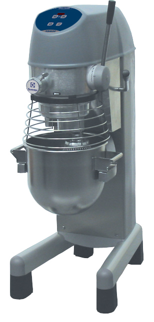 Floor model, suitable for all kneading, blending and whipping operations. Body in non-corrosive material with 20 litre 18/8 (AISI 302) stainless steel bowl. Powerful asynchronous motor (750 W) with mechanical speed variator (8 speed levels from 35 to 180 rpm). Water protected planetary system. Pivoting and removable wire safety screen. Water proof (IP55) and flat touch button control panel with 60 min. timer. A safety device will automatically stop the machine when the bowl is lowered. Adjustable feet for stability.Equipped with accessory drive hub type H (accessories are not included).Supplied with 3 tools: spiral hook, paddle and whisk.