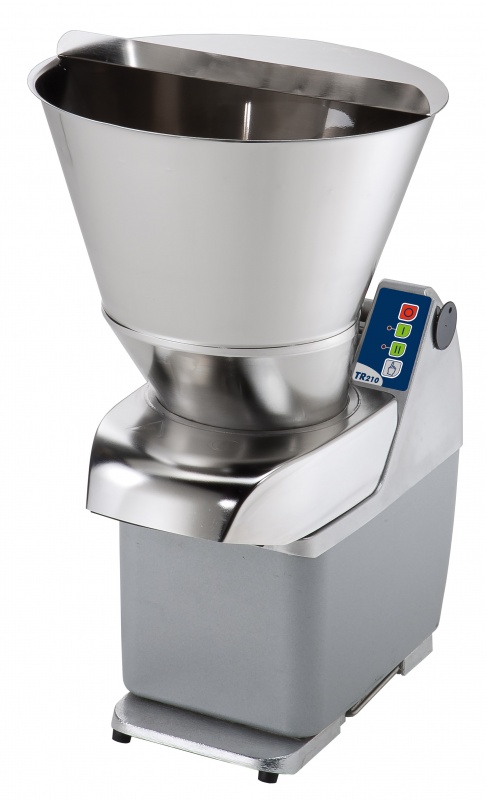 For medium catering facilities, up to 1000 meals per service, specially designed for slicing, grating, julienne and dicing. Stainless steel automatic feed hopper allows large scale preparations (up to 2100kg/h).Parts in contact with food - stainless steel hopper and cutting chamber - can be removed without tools and placed in a dishwasher for fast cleaning.Asynchronous industrial motor for heavy duty and longer life.Aluminum alloy motor base completely closed for complete protection against strong jets of water.Safety granted by magnetic micro switch which stops the machine if hopper is not correctly positioned.Waterproof (IP55) control panel with “no volt release' safety device. 2 speed model (340 and 680 rpm). Table top version. Manual lever-operated hopper, long vegetable hopper and ergonomic stand trolley available as optional accessories.
