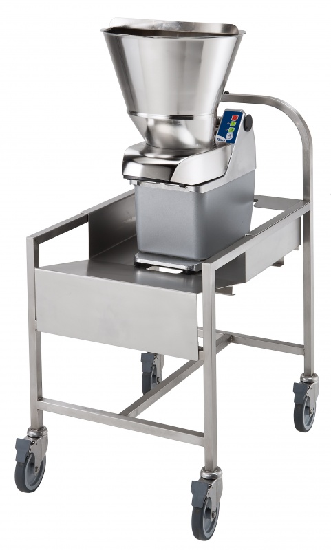 For medium catering facilities, up to 1000 meals per service, specially designed for slicing, grating, julienne and dicing. Stainless steel automatic feed hopper allows large scalepreparations (up to 2100 kg/h).Freestanding configuration thanks to the smart design trolley, which can host both the machine and the 2/1 GN tray to collect the cut vegetablesParts in contact with food - stainless steel hopper and cutting chamber - can be removed without tools and placed in a dishwasher for fast cleaning.Asynchronous industrial motor for heavy duty and longer life.Aluminum alloy motor base completely closed for complete protection against strong jets of water.Safety granted by magnetic micro switch which stops the machine if hopper is not correctly positioned.Waterproof (IP55) control panel with “no volt release' safety device. Two-speed model (340 and 680 rpm). Manual lever-operated hopper, long vegetable hopper available as optional accessories.