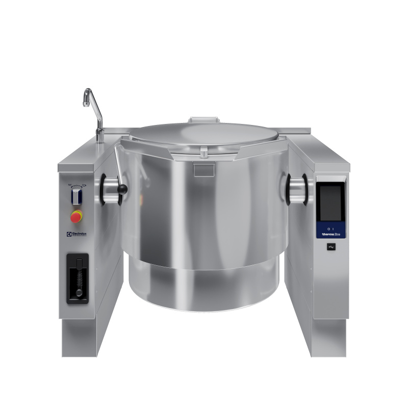 The Electrolux Professional PBOT15RLES (586944) tilting boiling pan is designed for preparing soups, sauces, creams, and cereals and for boiling water in small and medium-sized catering establishments and the food industry.