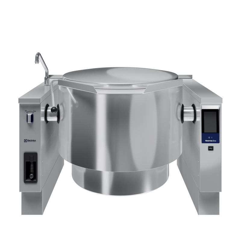 Catering establishments use electric tilting boiling pans like Electrolux Professional PBOT30EQES (586950) to prepare soups, broths, creams, sauces, mousse, porridge, and other products.