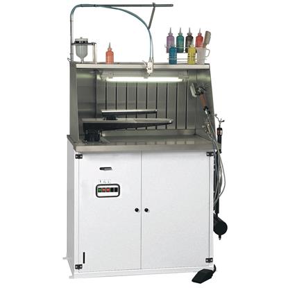 Spotting cabinet. Cold spotting gun, air drying gun, spotting group with pivoting vacuum bucks.