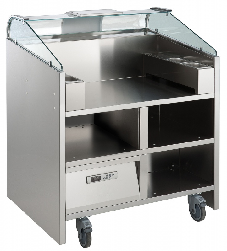 Can accommodate up to two electric table top appliances. Heavy duty stainless steel construction. Integrated radial fan (variable speed) ventilation system that reduces cooking odours from the cooking surfaces of the table top appliances. Air is filtered through the top of the appliance and released at the base. The self-contained air-filtration system is equipped with 3 filters, a dishwasher safe mechanical filter with a fine-meshed metal filter and a carbon activated filter. Large glass top suited for placing dishes to serve customers. Electrical plugs protected by covering plates. Side supports each holding n.2 GN 1/9 containers. Mounted on 4 swivelling wheels (two with brake). Rounded edges and smooth surfaces for easier cleaning. Cord and plug included. Optional accessories: drawers, tilting side shelves and customized front panels can be ordered on request.
