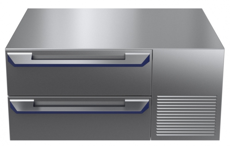 Refrigerated base with 2 drawers, able to oprate both as refrigerator or as freezer, with temperature range from -22°C to +8°C. Constructed according to 1.4301 (AISI 304) with anti-tilt runners accepting GN 1/1 containers. Built-in compressor unit to suit operating conditions. CFC free (ecological refrigerant type: R404a, - gas in foam: cyclopenthane). Flat surface construction, easily cleanable. Metal knobs and handles ergonomically designed with embedded hygienic silicon 'soft' grip enable easier handling and cleaning. IPX5 water resistance certification. Configuration: One-side operated freestanding base.