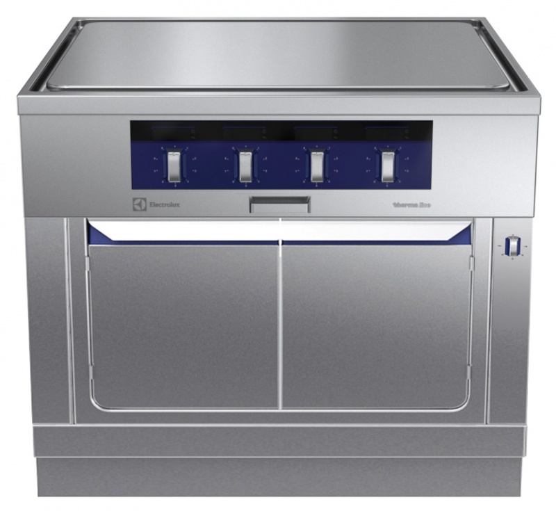 Unit constructed according to DIN 18860_2 with 20 mm drop nose top and 70 mm recessed plinth. Internal frame for heavy duty sturdiness in 2 mm and 3 mm in 1.4301 (AISI 304). 2 mm top in 1.4301 (AISI 304). Flat surface construction, easily cleanable. THERMODUL connection system enables seamless worktop when units are connected and avoids soil penetrating. ECOTOP model with a 14mm thick mild steel cooking surface with heat retaining coating. 4 independently controlled heating zones with 2 electronic sensors per zone for temperature surface control and 8 power levels. Rapid plate heat up, continuously ready to use. Overheat protection switches off the supply in case of overheating. Standby function saves energy and quickly recovers maximum power. Metal knobs with embedded hygienic silicon 'soft' grip enable easier handling and cleaning. 800 mm wide warming cabinet with 2 doors, constructed according to DIN 18860_2 with 70 mm recessed plinth. Internal frame for heavy duty sturdiness in 2 mm and 3 mm in 1.4301 (AISI 304). 2 mm top in 1.4301 (AISI 304). Flat surface construction, easily cleanable. THERMODUL connection system enables seamless worktop when units are connected and avoids soil penetrating. Temperature in the cabinet can be set through thermostat, up to a maximum of 110 °C. Cabinet storage space accepts GN 1/1 containers. IPX5 water resistant certification.